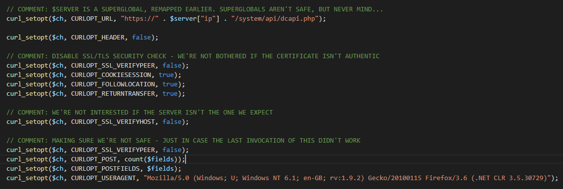 This means all updates are insecure - allowing an attacker to put anything on the device remotely. Note: I've added the comments in this screenshot to clarify what each line does.