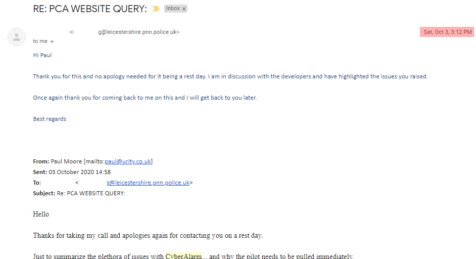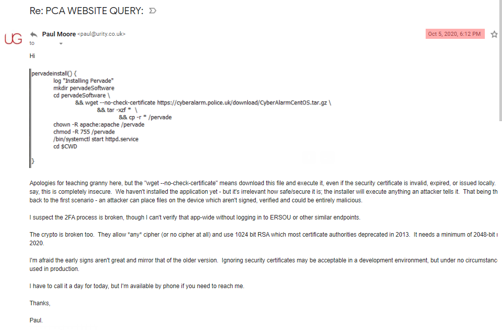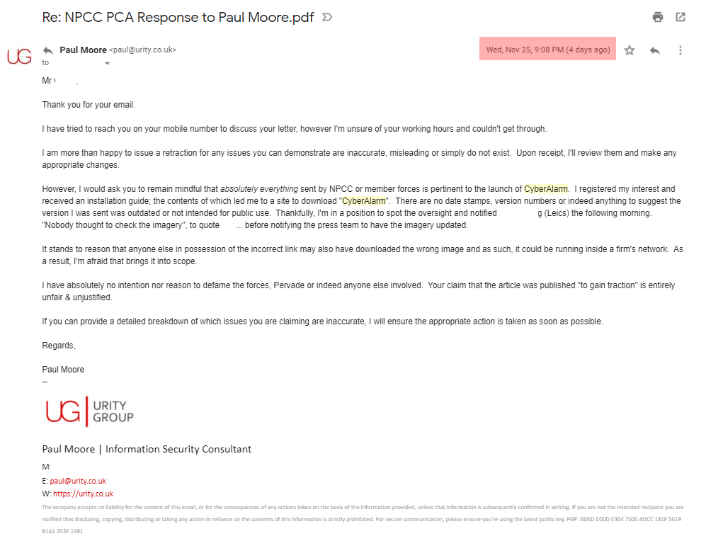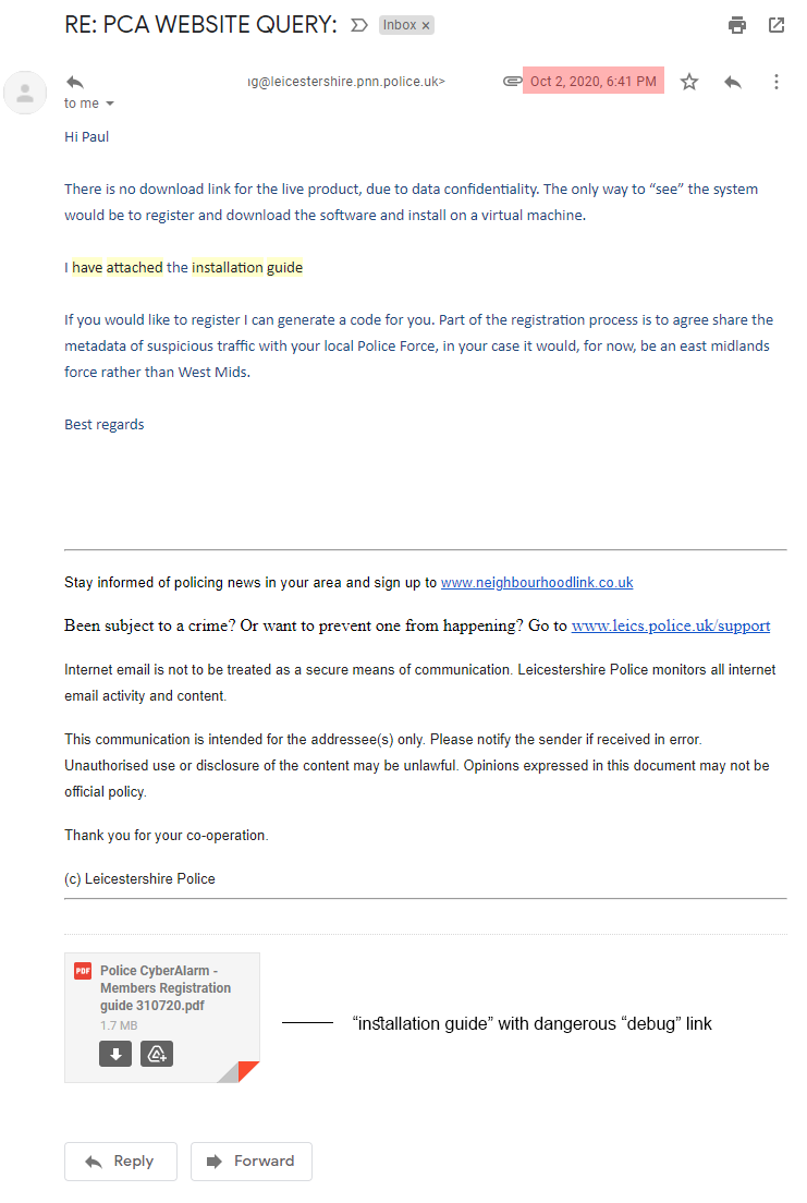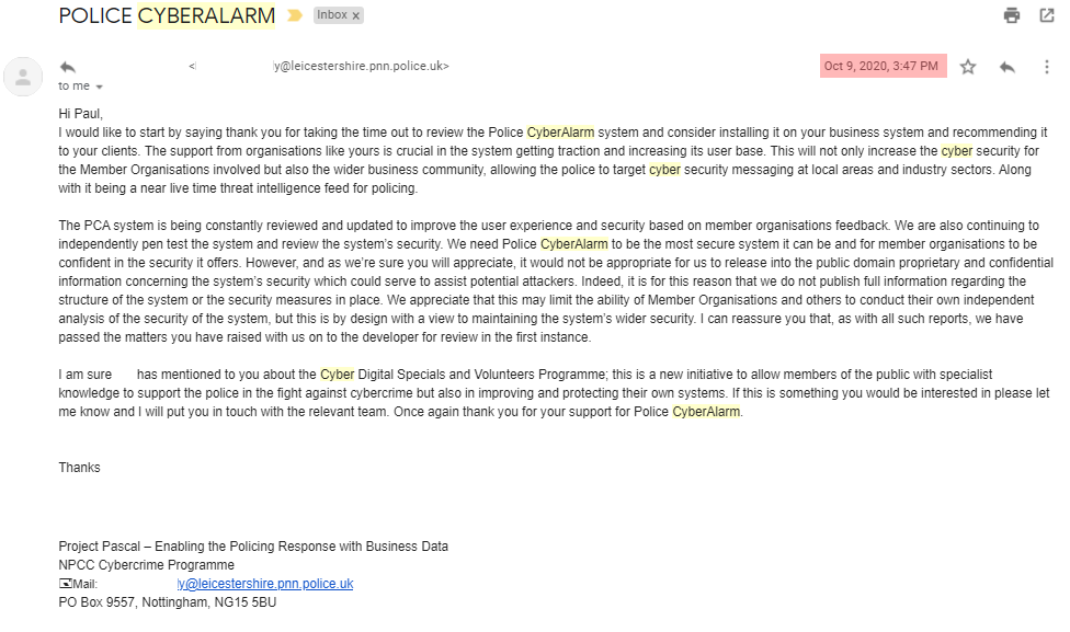 Upon request of the media, I withheld this article to give them time to question NPCC & Pervade. Unsurprisingly, they doubled-down and refused to accept there are serious issues with CyberAlarm. Following a call between NPCC and the media, they offered to send a link "to have a good look at", presumably to prove it's safe.
