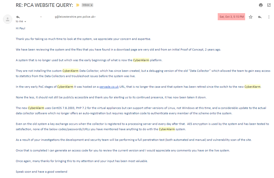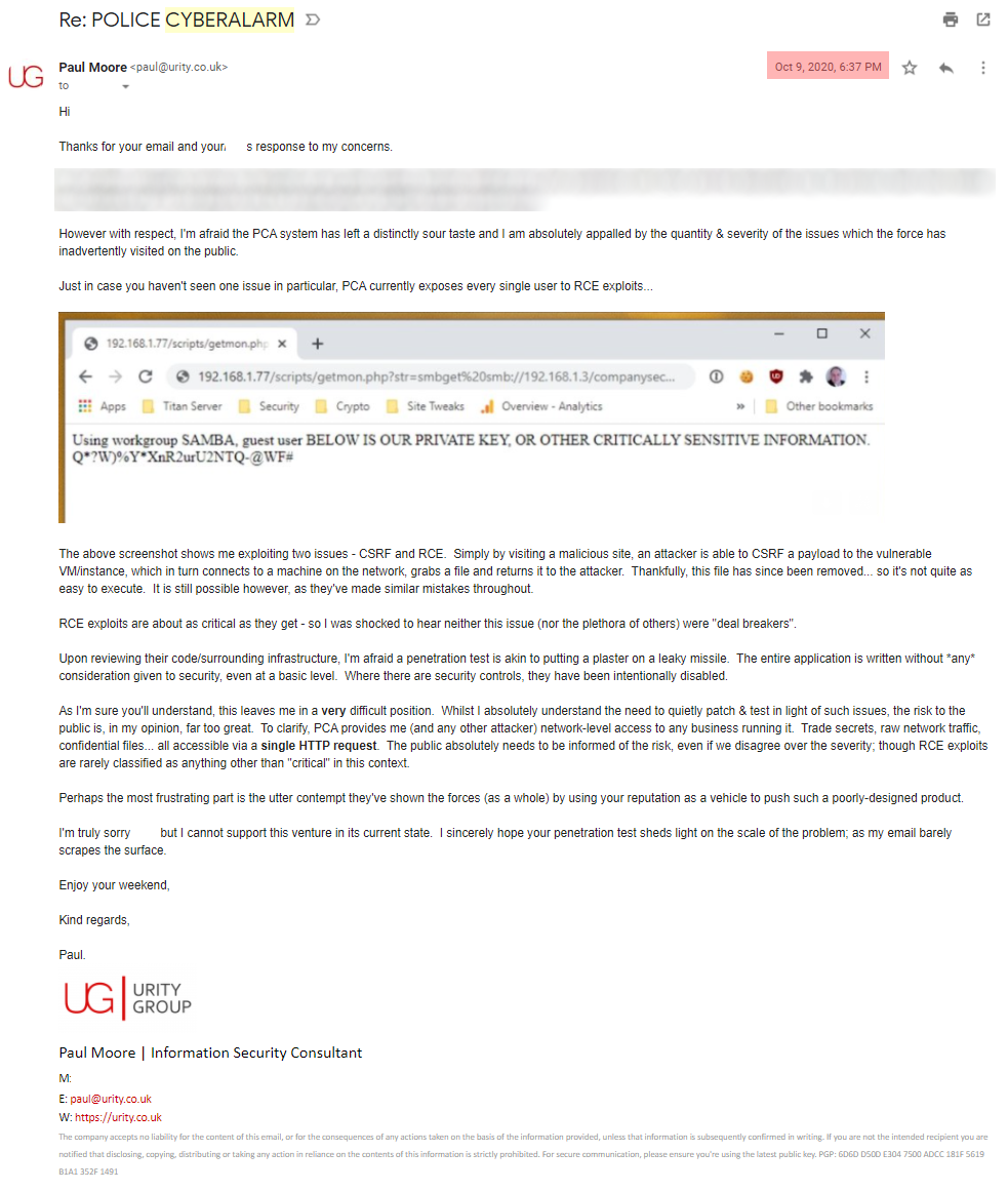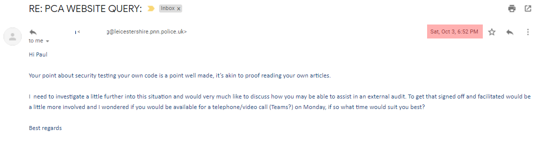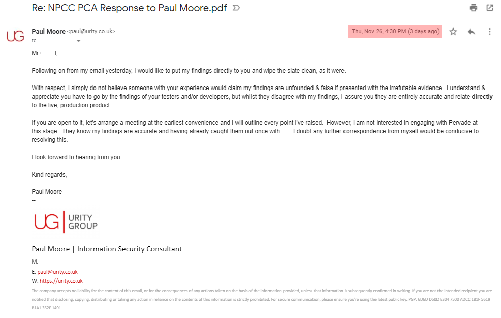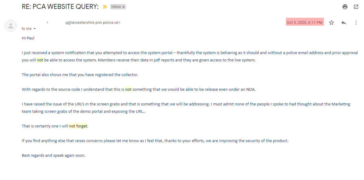 I've proven NPCC literally gave me the offending URL, so let's not go over that again. I've also demonstrated that I followed a fairly typical responsible disclosure process & they acknowledge my attempts to report the issues.