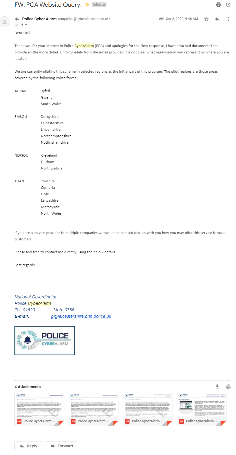 I received an email from Leicestershire Police, apologising for the delay and attaching 4 PDFs which include sample reports, threat summaries etc.