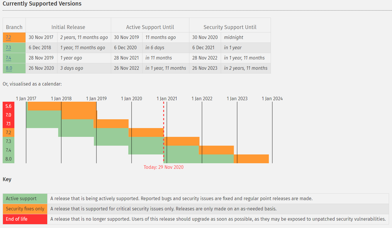 Official vendor support for PHP 5.4 ended 5 years ago. Official support for PHP 7.2 ended.... on the 30th November 2020 (seriously!). The vendor's (The PHP Group) official advice mirrors mine; upgrade as soon as possible because there may be unpatched security vulnerabilities.