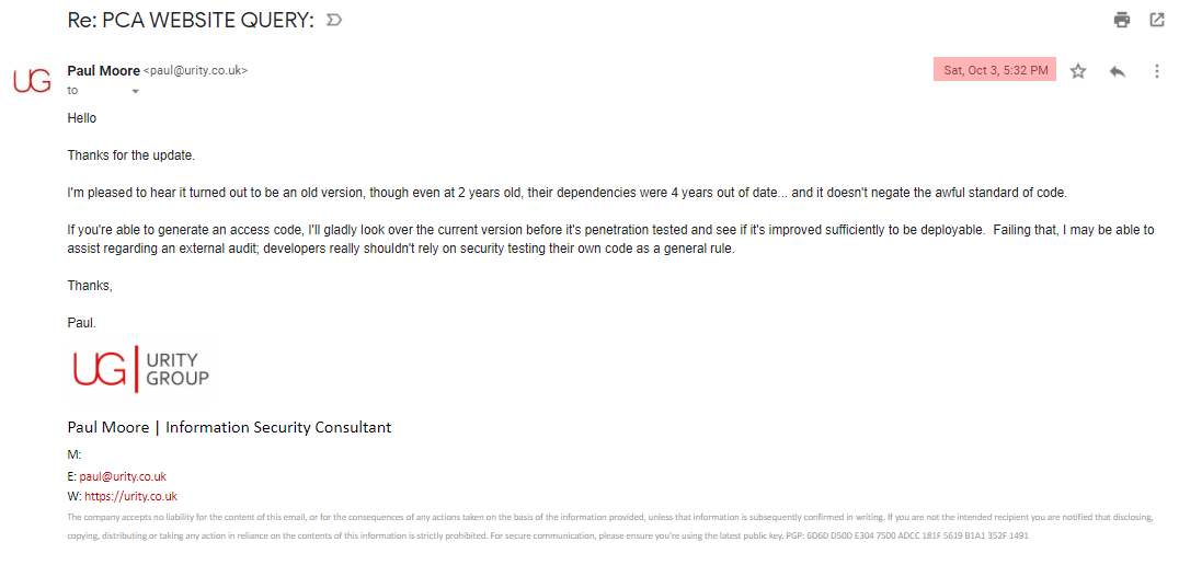 The next few days are spent relaying issues to <redacted> until finally, I'm told an independent penetration tester could not confirm any of the issues I'd raised.
