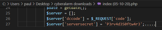 Pay careful attention to the statement "none of the below codes/passwords/URLs you have mentioned have anything to do with the CyberAlarm system", referring to "P3rv3d3" and "P3rv4d3S0ftw4r3" from my disclosure email.
