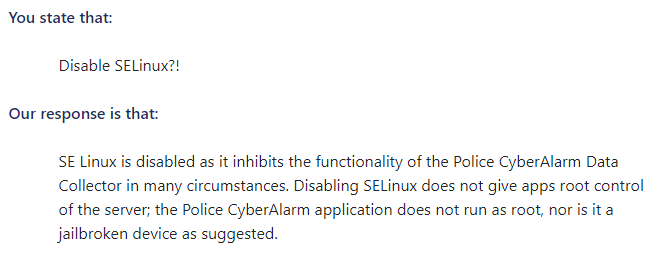 I assumed (how stupid of me, by now) that a direct quote from a Red Hat expert would make them reconsider their ludicrous decision. If someone describes Linux as a footgun, it's probably not a good idea to play around with security controls that you clearly don't understand.
