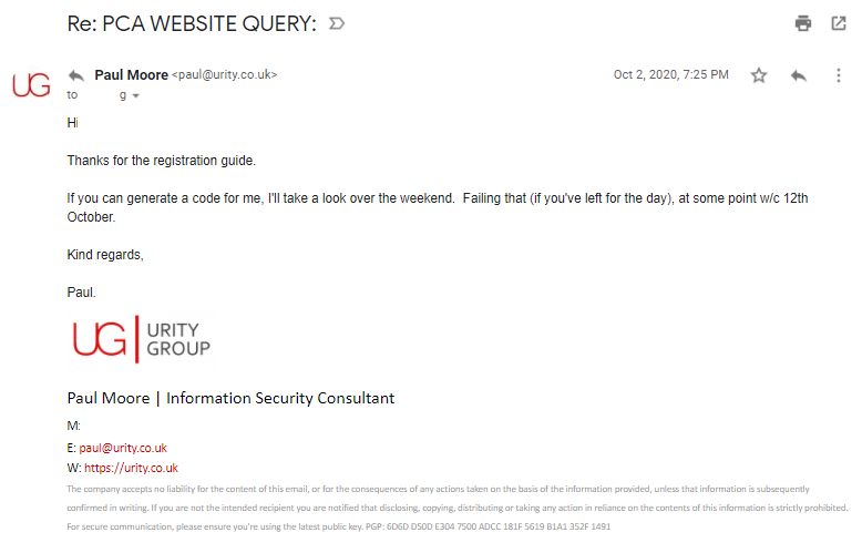 I'll snip out the dialog of us finding a suitable time/date for the teams meeting, but it ended up being 5th October 2020 @ 4PM, lasting well over an hour.