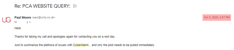 Despite being a rest day, he thankfully took my call and listened as I outlined everything I'd seen thus far. As expected, he asked me to put my findings in an email which I did shortly after.