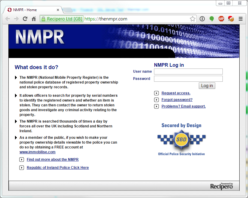"Immobilise can be used by members of the public and businesses to register their valued possessions or company assets, and exclusive to Immobilise all account holders registered items and ownership details are viewable on the Police national property database the NMPR. https://www.immobilise.com"