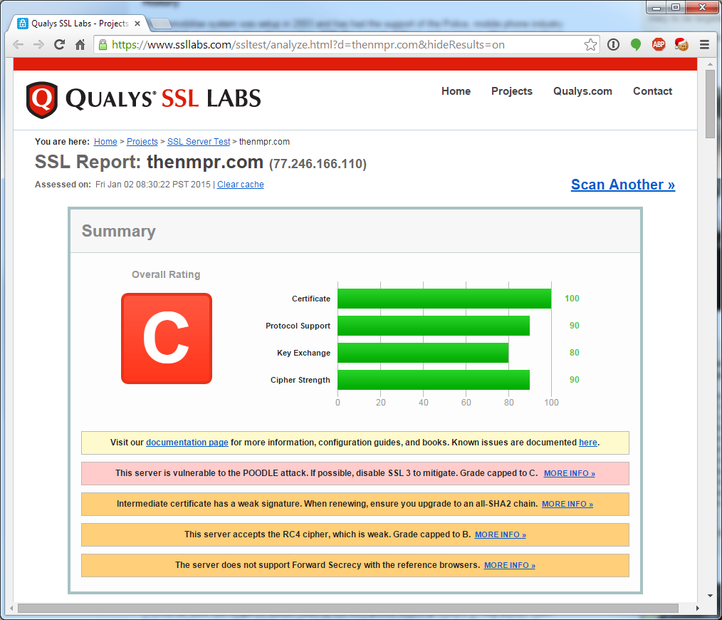 The POODLE/SSLv3 exploit at both NMPR and CheckMEND has also been resolved, with both scoring a healthy "A" at Qualys. Perhaps ironically, some forces are now unable to access the site because Internet Explorer (as shipped with Windows XP) is only able to use insecure protocols (SSLv3). It's now the responsibility of the affected forces to ensure their software meets current standards.