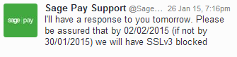 Responsible firms patched out POODLE months ago. SagePay are still lagging behind, so I raised the issue again on Twitter DM.