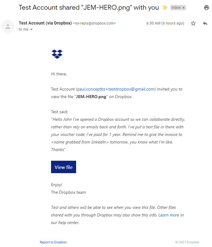 This attack however, comes from a genuine Dropbox email address, uses your name and cites your colleagues email address perfectly. The "note" asking for a reminder to pass on the invoice is yet another trust anchor, leading the second victim to believe this is a genuine email.